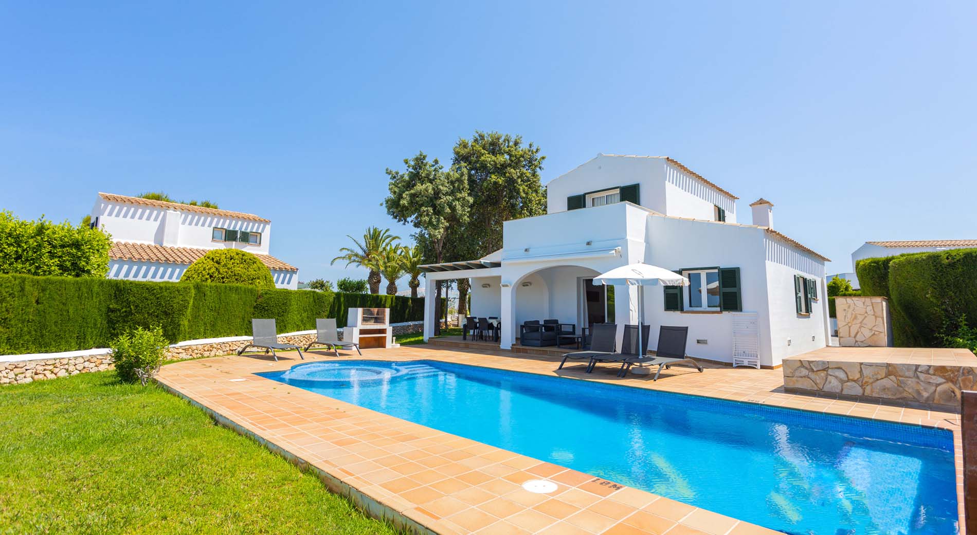 All'esterno, il rigoglioso giardino e la lounge ombreggiata offrono la cornice perfetta per un aperitivo, mentre la zona pranzo all'aperto vi invita a godervi le serate mediterranee sotto le stelle. Che vi stiate rilassando a bordo piscina con jacuzzi o esplorando le vicine spiagge di Son Bou, questa villa è una vera oasi di tranquillità e bellezza nel cuore di Minorca.